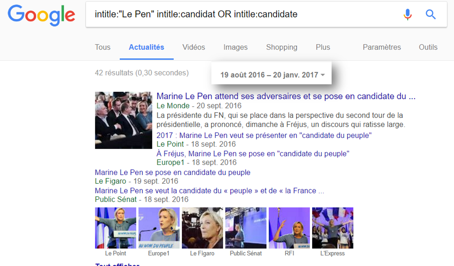 Cette capture d’écran présente la requête effectuée sur Google Actu à propos de Le Pen